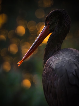Black stork, Ciconia nigra, standing in sunshine. Portrait black stork in the dusk. Black bird.