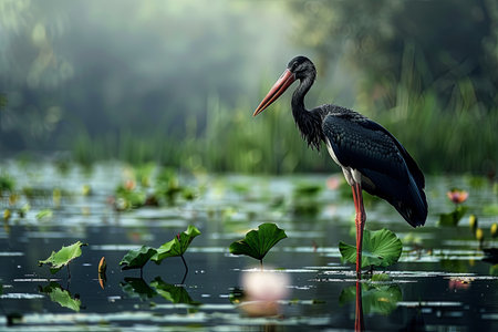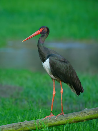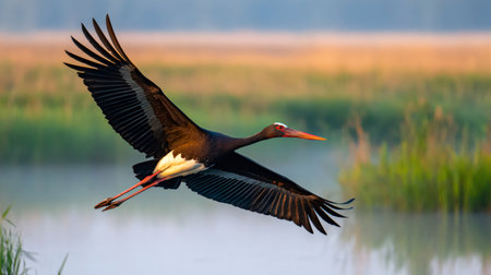 Black Stork - Ciconia nigra, beautiful iconic water bird from European fresh waters, Hortobagy, Hungary.