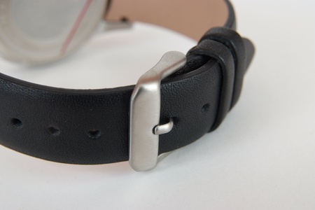 Close up of watch buckle on white background. Isolated black watch strap. Buckle and watch strap in perspective.