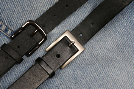 two black leather belt on a background of jeans