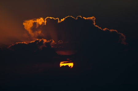 An orange sun peeks out under a large bank of clouds.