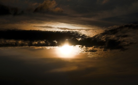 Close-up sunset through the clouds. Big orange sun.