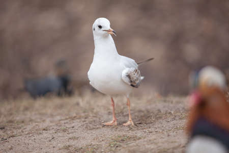 wild white seagull on the brown sand in the park