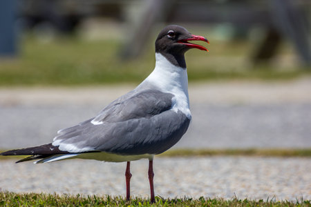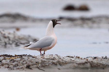 Brown-hooded Gull (Larus maculipennis) showing distinctive pink colouration on the coast of Sea Lion Island in the Falkland Islands