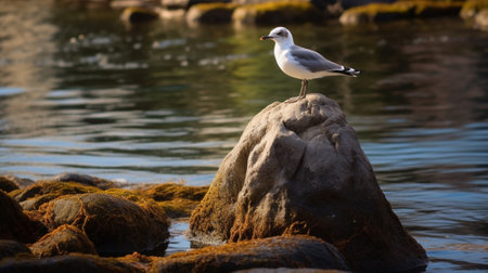 beautiful seagull resting on seashore boulder in warming sunshine