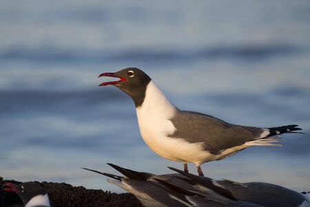 A Laughing Gull calls out loudly as the first rays of sun shine on it in the early morning with a blue water background.
