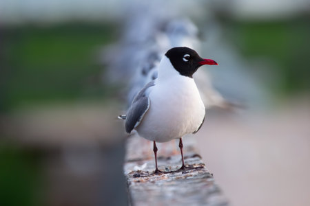 A Mediterranean gull (Ichthyaetus melanocephalus) perched next to mew gulls on a metal railing of the city Bremen.