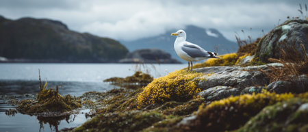 A white seagull perched atop a rocky outcropping with a picturesque view of the ocean, AI-generated.