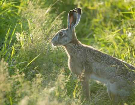 European hare (Lepus europaeus) medium-sized mammal with long ears sits in a field among grasses, viewed on a sunny day.