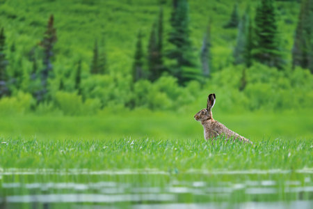Rabbit sitting on the top of the mountain in the summer.