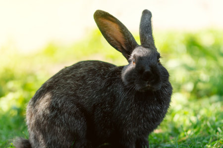 A black rabbit is sitting in the green grass on a sunny day. A rabbit eats grass on a green lawn with a blurred background on a bright summer day.