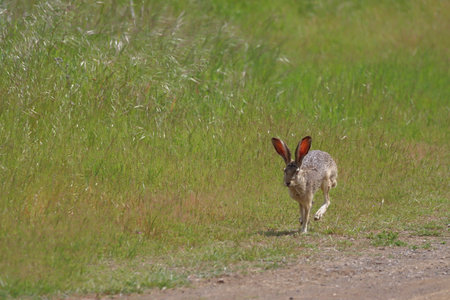 Rabbit running on the road in the meadow in summer.