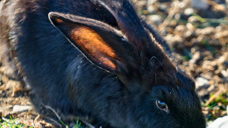 A detailed, close-up view of a dark-furred rabbit's head, highlighting its long ear with a striking orange interior.