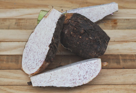 Fresh taro raw on wood background