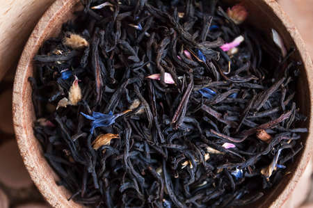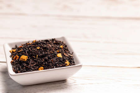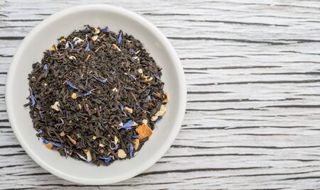 Dried black Earl Grey tea leaves in white bowl over wooden background