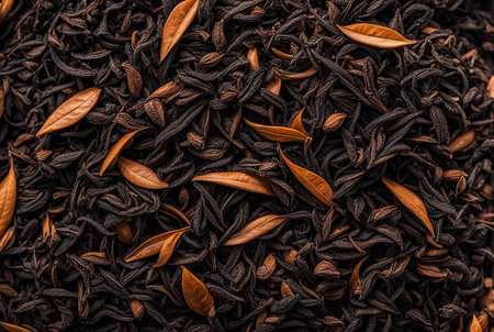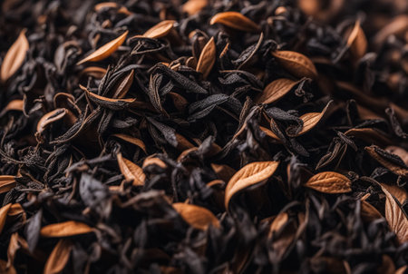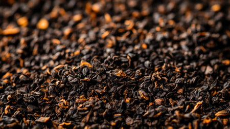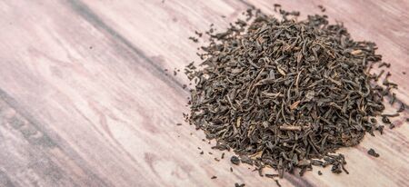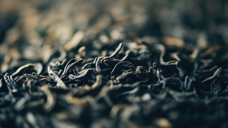 Close-up of black dry tea leaves wallpaper background, texture full frame banner or poster dried tea. Dark abstract food and drink backdrop. Advertising concept. High quality photo. Copy ad text space