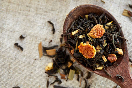 Closeup of a dark brown longhandled wooden spoon filled with scattered tea leaves and tiny pieces of dried citrus on light grey textured tablecloth. Shallow depth of field, selective focus, front focus.