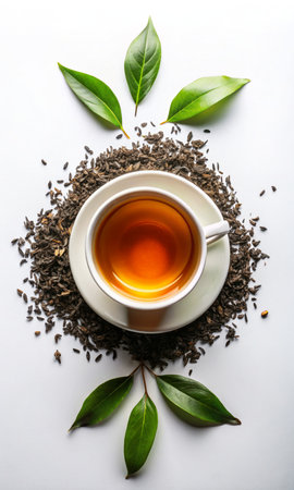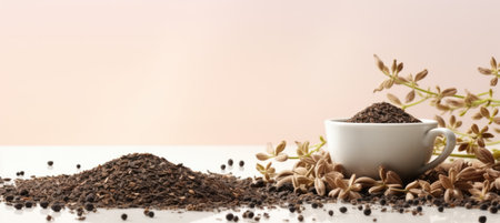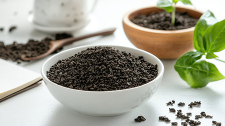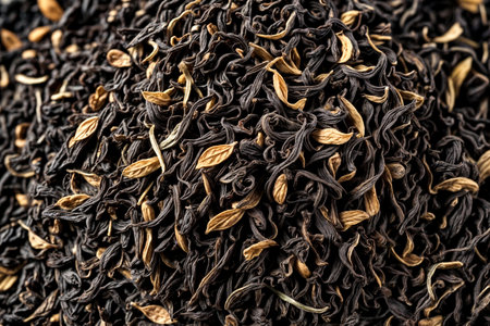 Artistic arrangement of black tea leaves with delicate white flower petals, showcasing natural textures and colors. Perfect for beverage inspiration and culinary presentations.