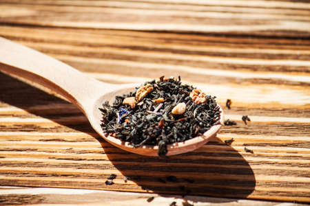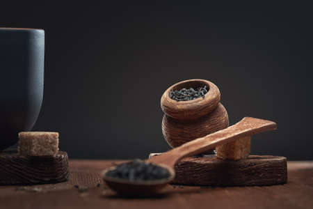 Tea leaves in a wooden plate and spoon on a black background. Asian style