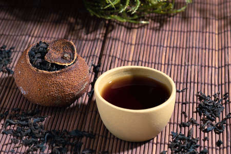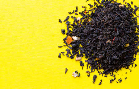 Leaves of black tea with bergamot and citrus on a yellow background. Loose tea. Copy Space