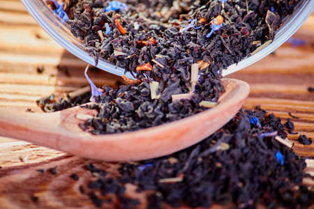 Dry tea leaves with flowersand fruits on wooden background with copyspace as a organic tea concept