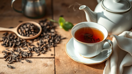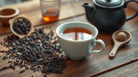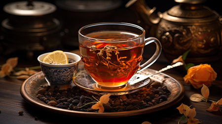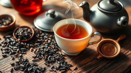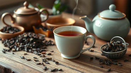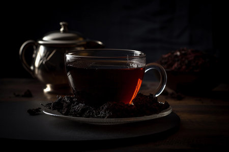 Cup of freshly brewed black tea, teapot and dry black tea on dark background with copy space. AI generated.