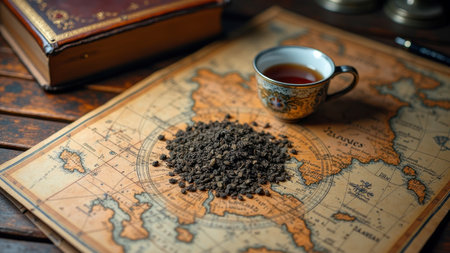 Cup of tea and tea leaves on vintage world map. That the image is generated using AI.