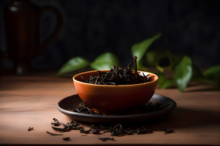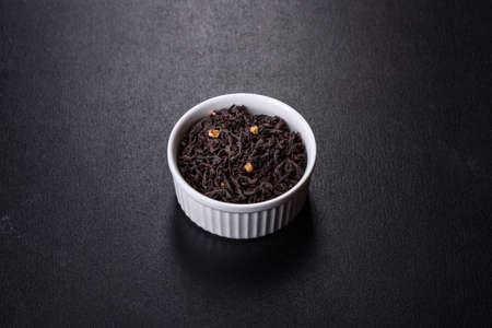 Dry black tea in ceramic bowl on dark background with copy space. AI generated.