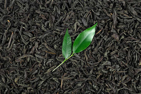 Black large-leaf tea as a background. Texture of dry black tea leaves. Dark background