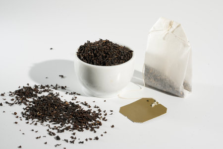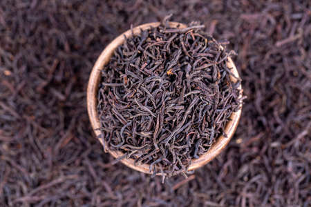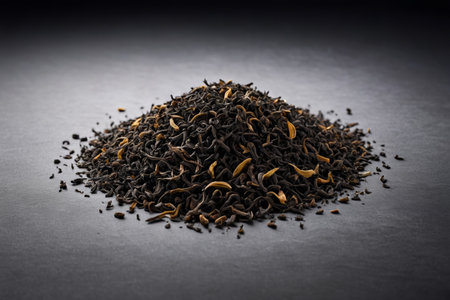Close-up of dry black tea leaves in a small ceramic cup, with fine details and rich color highlighted on a dark background.