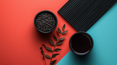 Flat-lay of coffee beans and a cup of brewed coffee on a bold red and teal background, complemented by black accents and artistic arrangement.