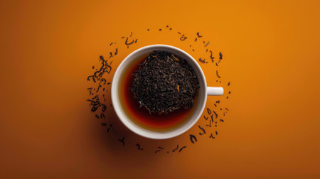 A cup of black tea in a ceramic yellow cup with dry tea scattered on a yellow background. Copy space. Top view.