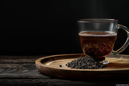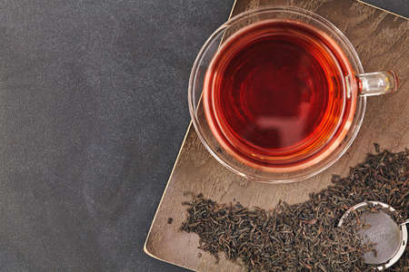 Glass cup of hot tea on dry black tea leaves on wooden backgtound. Top view.