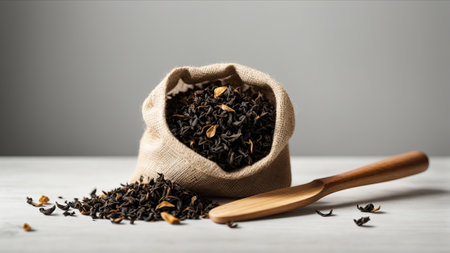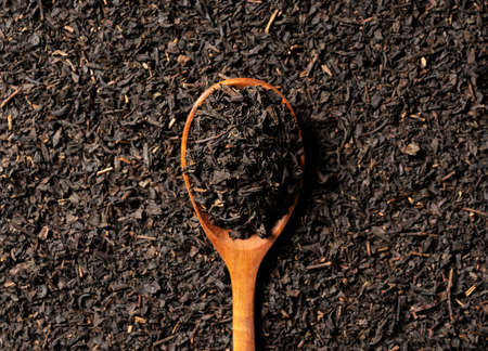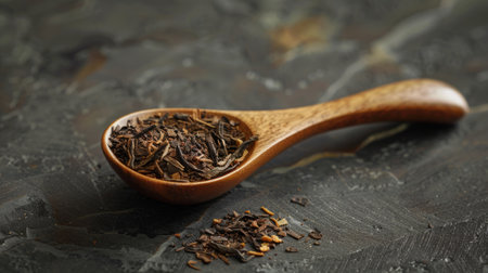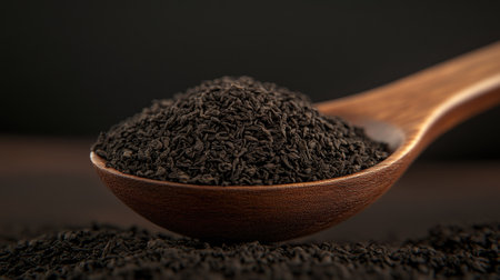 AI Generated. Close up of black tea on a wooden spoon on a dark background