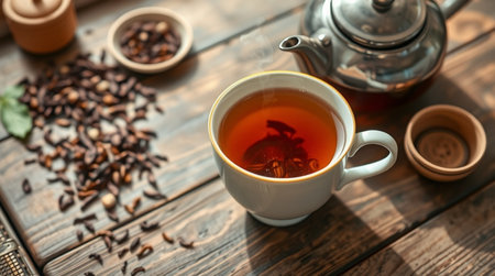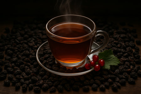 AI generated photo of hot herbal tea made from dried raisins served in a glass cup on wooden surface with steam rising and vintage lighting mood