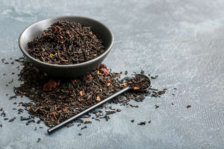 Leaves of black tea with bergamot and citrus on a black background. Loose tea in a heap. Copy Space