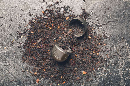 Black tea in open strainer with chain on scattered tea on wooden background. Concept of a tea shop.