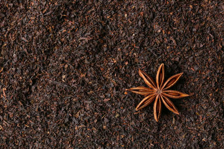 Close up black dry tea leaves wallpaper background. Texture full frame banner or poster dried tea. Dark abstract food and drink backdrop. Advertising concept. High quality photo. Copy ad text space