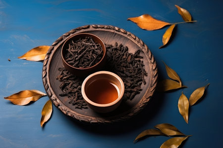 Flat lay of dried pu-erh tea leaves on a blue background, part of a tea ceremony.