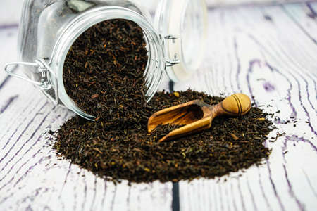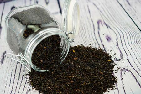 Detailed view of dry black tea leaves spilling from a glass jar onto a table, capturing the fine, curled texture and rich color.