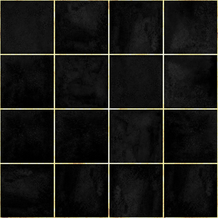 Abstract grunge geometric seamless pattern. Monochrome black hand drawn watercolor artwork with squares and gold line. Watercolour mosaic texture. Print for textile, wallpaper, wrap, interior, tiles.