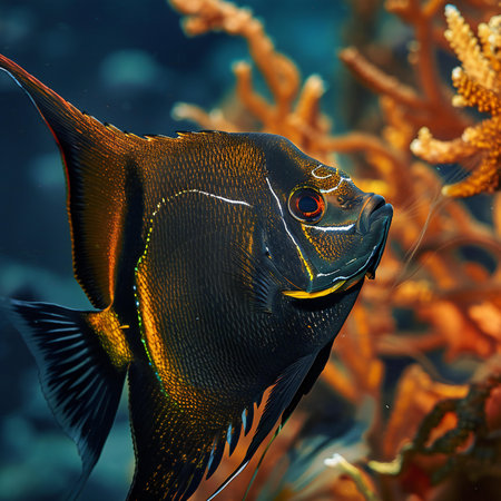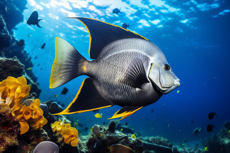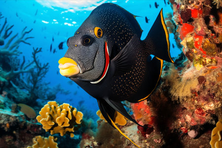 French Angelfish displays its striking black and yellow colors while swimming in a pristine environment highlighting its natural beauty and intricate details.