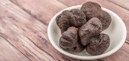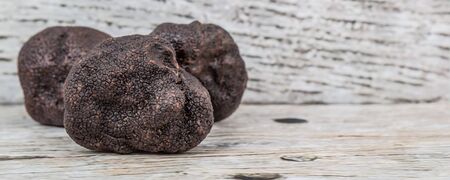 Black truffles piled on a wooden surface forming a perfect banner background for gourmet advertising