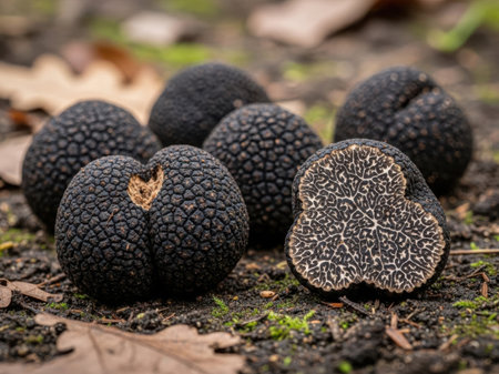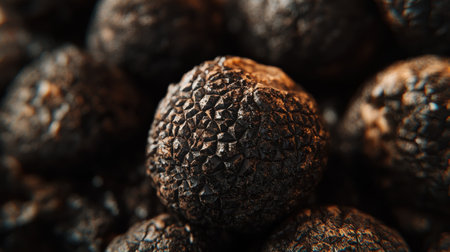 A detailed look at truffles revealing their intricate texture and earthy dark color, highlighting the gourmet ingredient's appeal in fine dining and culinary arts.