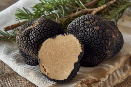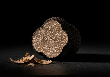 Luxurious whole black truffle mushroom cut to show its texture, with fresh shavings on a dark background. A rare gourmet delicacy.