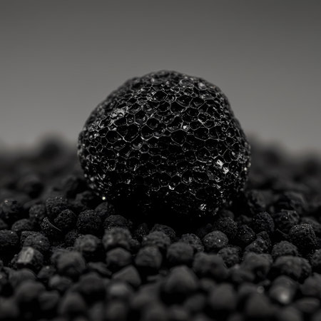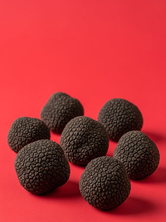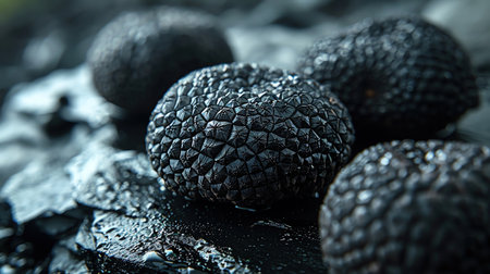 Black truffles on dark surface, macro shot, dramatic lighting, gourmet