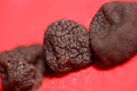 Wild fresh black winter truffle mushrooms close up background big size tuber instant prints botanical stock photography