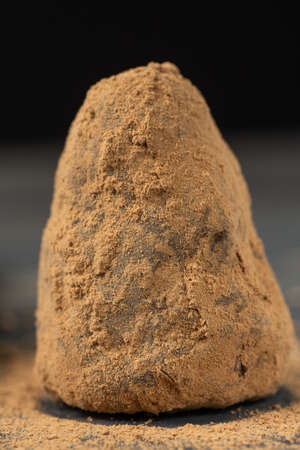 Close up of a chocolate truffle dusted with cocoa powder, with powder falling around it against a dark background.