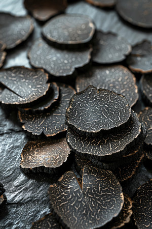 Closeup of black truffle slices on a dark surface, glossy and textured