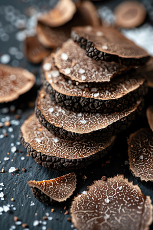 Sliced black truffles with salt on dark surface, detailed closeup, gourmet food